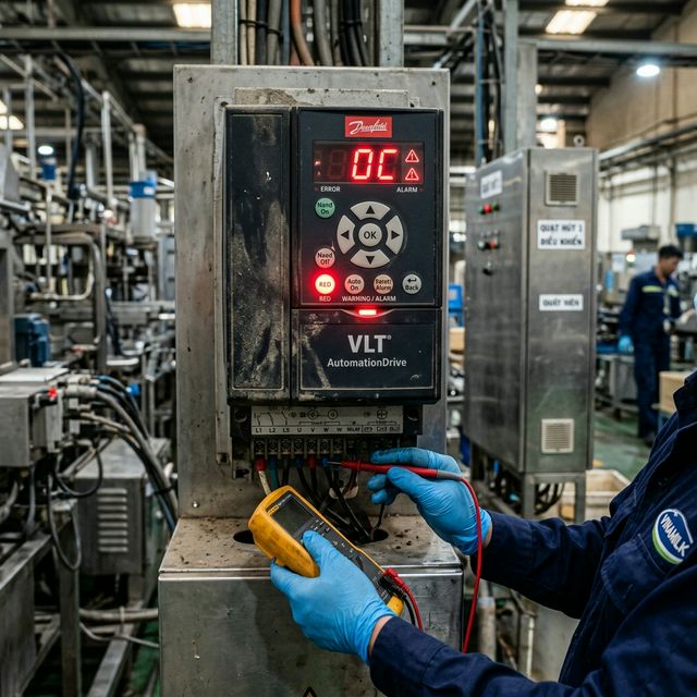 Dấu hiệu: Lỗi OC xuất hiện ngẫu nhiên, không theo quy luật. Dòng hiển thị trên biến tần không khớp với kìm đo dòng thực tế.